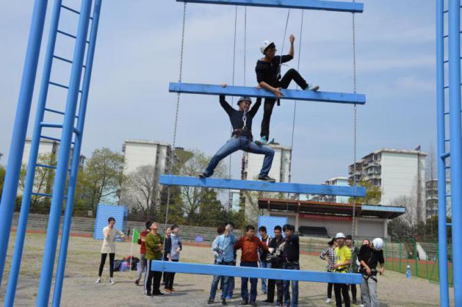 本次训练有攀摇摆天梯、竞技七巧板、翻越逃生墙和惊险倒计时等4个训练项目。在具体的训练中,18名学生干部在毛乔宇教练的组织与带领下,分为两队,选好队长,确定队名、队歌和口号之后, 头顶烈日,心揣忐忑与期待,进行了整整1天的艰苦训练。